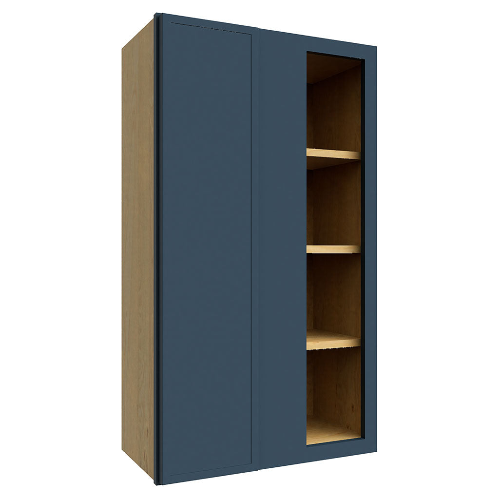 Introducing the WBC2442, a single door blind corner wall cabinet in a stunning indigo color. With dimensions of 24"W x 42"H x 12"D, this Luna style cabinet is perfect for maximizing storage space. Add a touch of elegance and functionality to your kitchen with this cabinet.